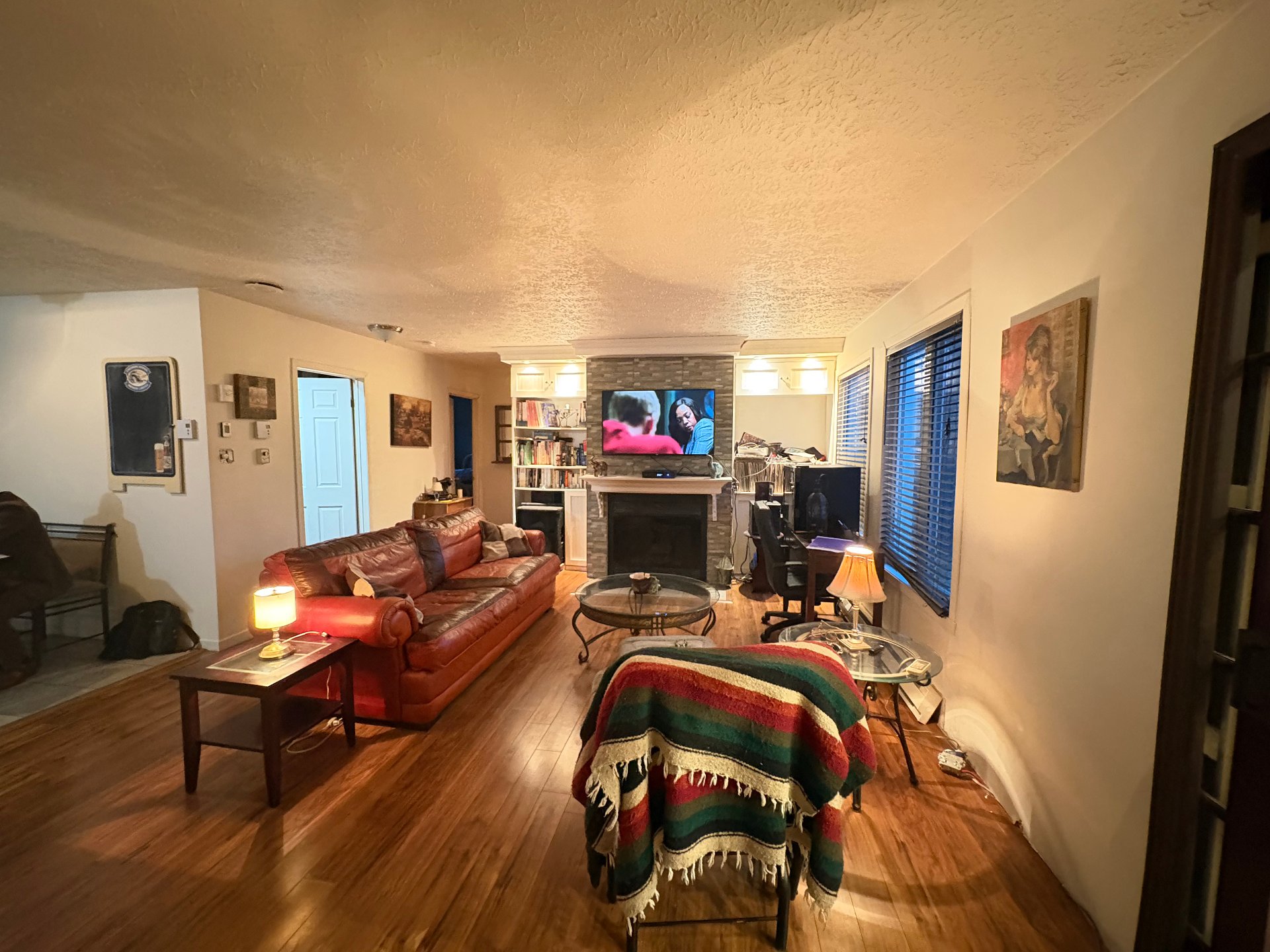 includes three bedrooms, a full kitchen, a cozy living